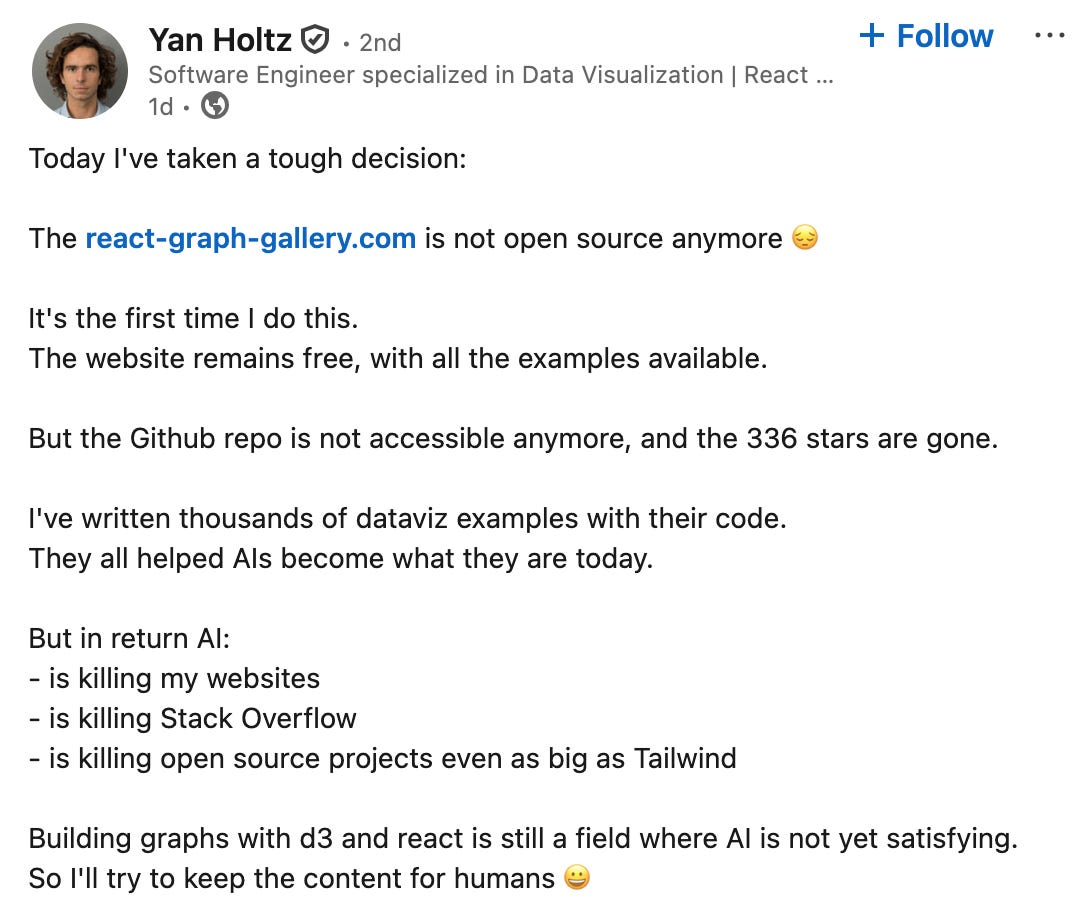 Tailwind isn’t the only example of open-source code struggling. Yan Holtz maintains several popular galleries with data visualisation examples and code. But earlier this week, he announced on LinkedIn this would no longer be openly available: