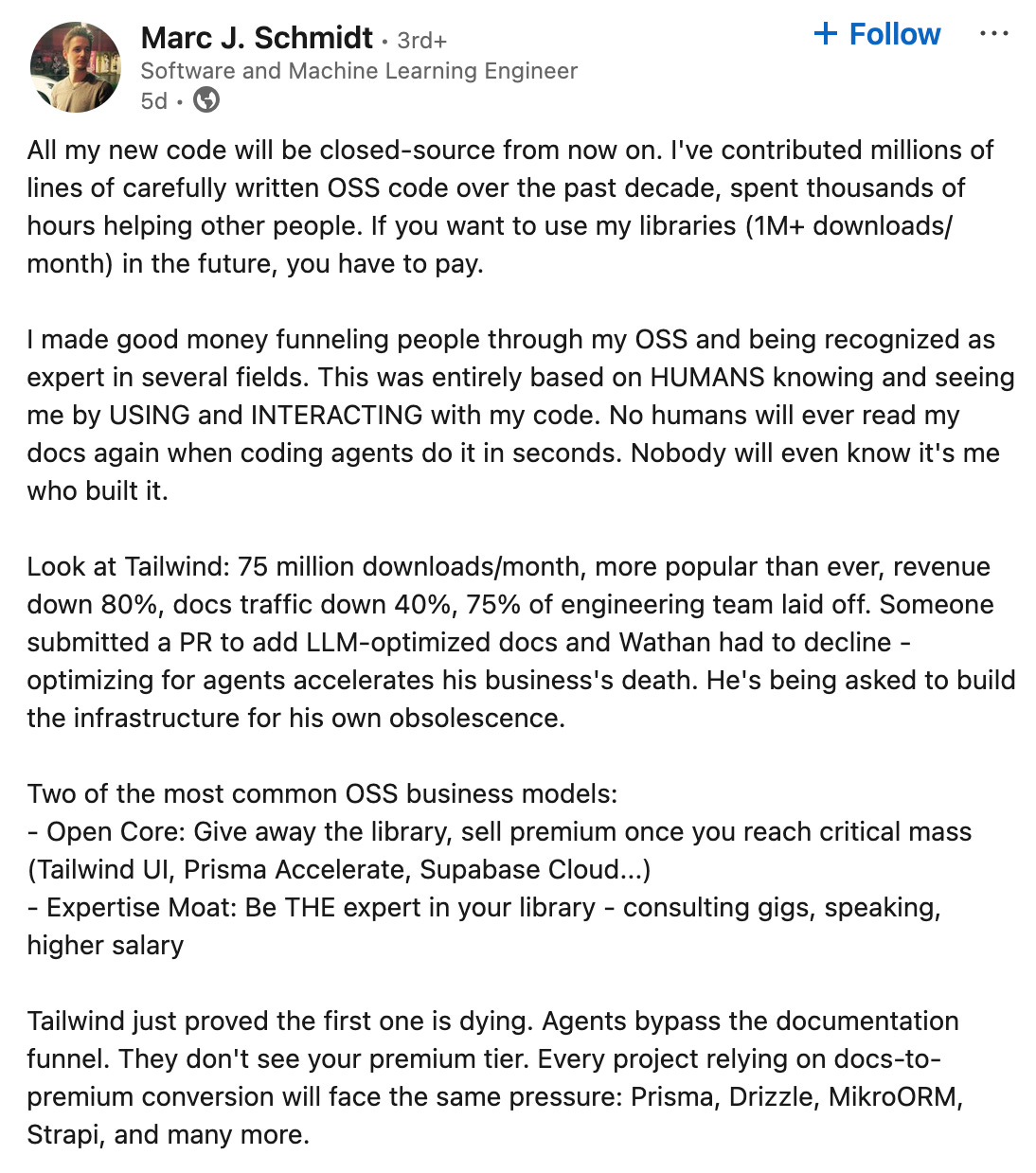 Last week, the CEO of Tailwind Labs, which makes a popular open-source CSS framework, announced they were having to lay off three quarters of their engineers. He pointed to the ‘brutal impact AI has had on our business’, which relies on users visiting the website and converting to their commercial plans. If you can get the code you need via an external AI chatbot, there is no incentive to visit, and no opportunity to discover these options.