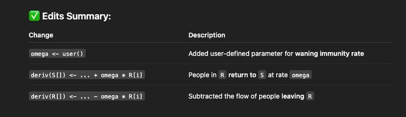 Having code explanations and examples to hand can make AI-assisted work much more powerful. Last year, I ran some drop-in sessions with our outbreak analytics and applied modelling short course cohort. As part of one session, we used GPT to adapt an existing model in real-time, in response to a participant question about how to incorporate waning immunity: